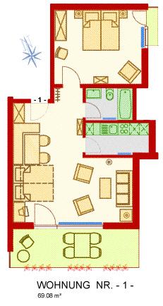 Wohnung Nr. 1 2-Zi.-App. für 2-4 Pers. ca. 70 m⊃2; Wohnzimmer m. Südbalkon, Schrankbetten für 3.+4. Person, Schlafzimmer mit Ostbalkon, separate Küche, Bad mit Badewanne und WC.