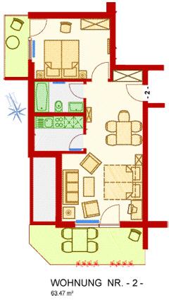 Wohnung Nr. 2 2-Zi.-App. für 2-4 Pers. ca. 64 m² Wohnzimmer m. Südbalkon, Schrankbetten für 3.+4. Person, Schlafzimmer mit Westloggia, separate Küche, Bad mit Badewanne und WC.