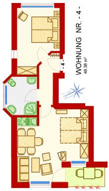Wohnung Nr. 4 2-Zi.-App. für 2-4 Pers. ca. 50 m⊃2; Wohnraum mit West-Balkon, Laminatboden mit Holzstruktur-Oberfläche, Schrankbetten für 3.+4.Person, Küche integriert, Schlafzimmer, Badezimmer mit begehbarer Dusche, WC, 2 separate Waschbecken, mit Fenster.